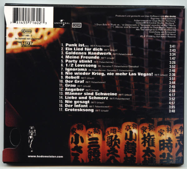 Gonzalez/Felsenheimer) 3:56 1. Punk ist... (M/T: Felsenheimer) 3:41 2. Ein Lied für dich (M/T: Urlaub) 2:43 3. Goldenes Handwerk (M/T: Felsenheimer) 3:34 4. Meine Freunde (M/T: Urlaub) 1:47 5. Party stinkt (M/T: Felsenheimer) 3:26 6. 1/2 Lovesong (M: Gonzalez/T: Felsenheimer/Gonzalez) 3:52 7. Ignorama (M: Felsenheimer, Gonzalez/T: Felsenheimer) 2:46 8. Nie wieder Krieg, nie mehr Las Vegas! (M/T: Urlaub) 3:51 9. Rebell (M/T: Urlaub) 3:51 10. Der Graf (M/T: Felsenheimer) 3:44 11. Grau (M/T: Urlaub) 2:45 12. Angeber (M/T: Urlaub) 2:58 13. Männer sind Schweine (M/T: Urlaub) 4:17 14. Liebe und Schmerz (M/T: Felsenheimer) 3:52 15. Nie gesagt (M/T: Urlaub) 4:57 16. Der Infant (M/T: Felsenheimer) 3:05 17. Grotesksong (M/T: Urlaub) 3:40 |