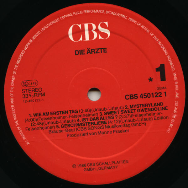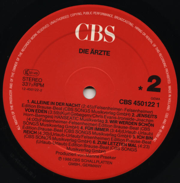 | 1986 | Die Ärzte | 12" LP | CBS | 450 122 1 |