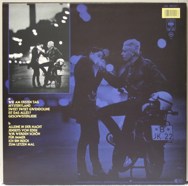 | Tracklist | Seite A: 1. Wie am ersten Tag [M/T: Urlaub] 3:41 2. Mysteryland [M/T: Felsenheimer] 4:02 3. Sweet Sweet Gwendoline [M/T: Urlaub] 2:50 4. Ist das Alles? [M/T: Felsenheimer] 3:39 5. Geschwisterliebe [M/T: Urlaub] 4:11 Seite B: 6. Alleine in der Nacht [M/T: Felsenheimer] 2:47 7. Jenseits von Eden [M/T: Kurt Gebegern/Chris Evans-Ironside-Joachim Horn-Bernges] 4:00 8. Wir werden schön [M/T: Felsenheimer] 4:01 9. Für immer [M/T: Urlaub] 3:46 10. Ich bin reich [M/T: Urlaub/Urlaub, Felsenheimer] 4:22 11. Zum letzten Mal [M/T: Urlaub] 4:24 |