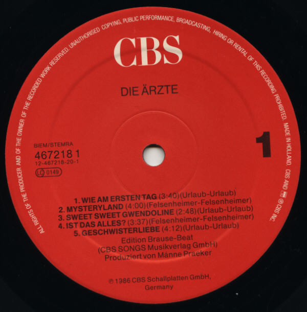 | 1990 | Die Ärzte | 12" LP | CBS | 467 218 1 |