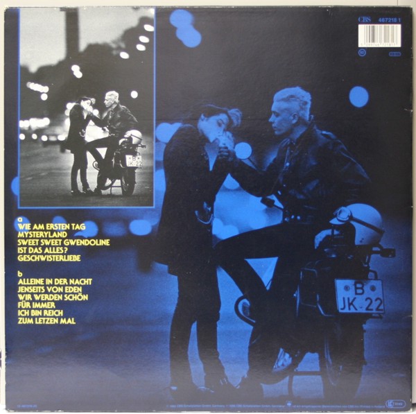 | Tracklist | Seite A: 1. Wie am ersten Tag [M/T: Urlaub] 3:41 2. Mysteryland [M/T: Felsenheimer] 4:02 3. Sweet Sweet Gwendoline [M/T: Urlaub] 2:50 4. Ist das Alles? [M/T: Felsenheimer] 3:39 5. Geschwisterliebe [M/T: Urlaub] 4:11 Seite B: 6. Alleine in der Nacht [M/T: Felsenheimer] 2:47 7. Jenseits von Eden [M/T: Kurt Gebegern/Chris Evans-Ironside-Joachim Horn-Bernges] 4:00 8. Wir werden schön [M/T: Felsenheimer] 4:01 9. Für immer [M/T: Urlaub] 3:46 10. Ich bin reich [M/T: Urlaub/Urlaub, Felsenheimer] 4:22 11. Zum letzten Mal [M/T: Urlaub] 4:24 |