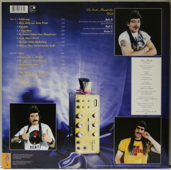 | Tracklist | Seite A: 1. Erklärung [M/T: Felsenheimer, Gonzalez, Urlaub/Felsenheimer] 0:55 2. Mein Baby war beim Frisör [M/T: Urlaub] 2:16 3. Vokuhila Superstar [M/T: Felsenheimer] 4:59 4. 3-Tage-Bart [M/T: Felsenheimer, Urlaub/Urlaub] 3:03 5. No Future (Ohne neue Haarfrisur [M/T: Urlaub] 2:07 6. Look, Don't touch [M/T: Felsenheimer] 2:15 7. Straight outta Bückeburg [M/T: Urlaub] 4:28 8. Medusa-Man (Serienmörder Ralf) [Felsenheimer, Ludwig/Felsenheimer] 5:56 Seite B: 1. Haar [M/T: McDermot, Ragni, Rado/dt. Text Brandin] 4:07 2. Dauerwelle vs. Minipli [M/T: Felsenheimer, Gonzalez/Urlaub] 0:53 3. Der Afro von Paul Breitner [M/T: Felsenheimer, Gonzalez/Urlaub] 1:59 4. Motherfucker 666 [M/T: Urlaub] 3:00 5. Monika [M/T: Urlaub] 0:44 6. Hair Today, Gone Tomorrow [M/T: Felsenheimer] 2:54 7. Am Ende meines Körpers [M/T: Urlaub] 2:46 8. Kaperfahrt [M/T: trad. Arrangement] 2:20 9. Zusammenfassung 0:04 |
