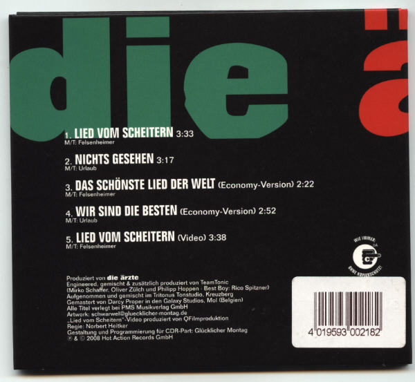 Felsenheimer] 3:33 2. Nichts gesehen [M/T: Urlaub] 3:17 3. Das schönste Lied der Welt (Economy-Version) [M/T: Felsenheimer] 2:22 4. Wir sind die Besten (Economy-Version) [M/T: Urlaub] 2:52 5. Lied vom Scheitern (Video) [M/T: Felsenheimer] 3:38 |