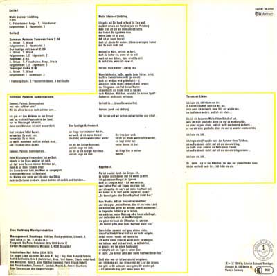 | Tracklist | Seite 1: 1. Mein kleiner Liebling [M/T: Felsenheimer, Runge/Felsenheimer] 2:26 Seite 2: 1. Sommer, Palmen, Sonnenschein [M/T: Urlaub] 2:50 2. Der lustige Astronaut [M/T: Urlaub] 2:29 3. Kopfhaut [M/T: Urlaub/Felsenheimer, Runge, Urlaub] 2:48 4. Teenager Liebe [M/T: Urlaub] 3:18 |